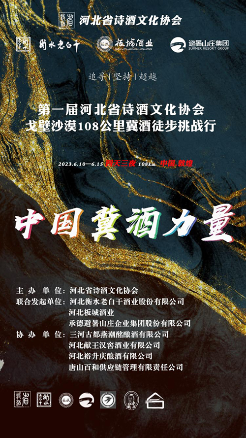 6月10日至6月15日,由河北省诗酒文化协会主办,河北衡水老白干酒业股份有限公司、河北板城酒业、承德避暑山庄企业集团股份有限公司联合发起,三河古都燕潮酩酿酒有限公司、河北献王汉窖酒业有限公司、河北裕升庆酿酒有限公司、唐山百和供应链管理有限责任公司等单位共同协办的第一届河北省诗酒文化协会戈壁沙漠108km冀酒徒步挑战行将在甘肃敦煌举行,“中国冀酒力量”的大旗将河北酒行业紧密团结一起,凝心聚力,向世界,向未来,砥砺前进。