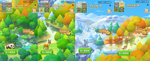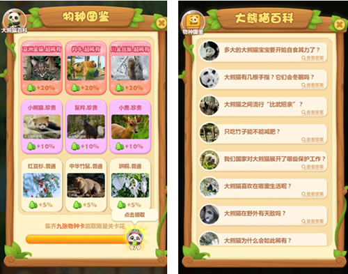 乐元素每年都有科普公益活动,常做常新。以《开心消消乐》的“守护之旅”为例,为了让玩家眼前一亮,不仅在活动期间为每一个代表物种(大熊猫、雪豹、林麝、水獭)分别开设体验周关卡,保证充分体验每一个代表物种相关的奇幻生境。策划和美术团队“火力全开”、“绞尽脑汁”,科普创新在升级:首创完整大地图模式,打开活动页面,滑动手指即可看到国家公园的四季时令变化,可谓看尽四大代表物种的春夏秋冬;首创生境场景升级玩法,带玩家身临其境体验熊猫宝宝的竹林生态变化,还能看到熊猫进食的待机萌态。除此之外,科普也是“来真的”:收纳超过30张动植物罕见图片、70个科普趣味见闻及问答,俨然成为一部移动的“动植物科普小宝典”。