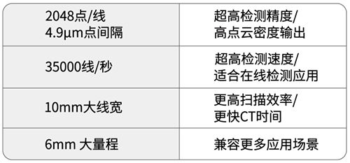 HPS-LCX3000延续LCX系列标志性的无遮挡盲区、超高速、高精度、高分辨率等特点,在结构、材料、光学、算法等方面均进行了迭代升级,优化了线长及量程,大幅度提高了检测效率。