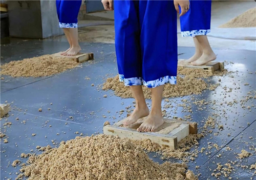 当一粒粒颗粒饱满的小麦进入制曲车间,王丙乾酒厂的酿酒师傅们恪守古训,传承古法,开启忙碌的高温制曲工艺。小麦润水、磨碎、拌入曲母、少女踩曲、堆曲发酵、曲仓储藏....,10多道工序、5000多个小时的培育,每一个环节都把天时地利人和运用到极致,饱含了酿酒师傅的匠心与耐心。