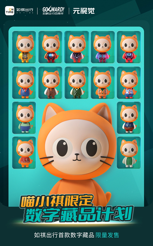 在如祺出行经典IP形象喵小祺诞生一周年之际,视觉中国旗下元视觉艺术网为如祺出行提供定制化解决方案,融合AIGC与web3.0前沿科技,打造独一无二的变装款喵小祺生日典藏系列数字头像。