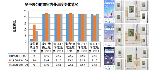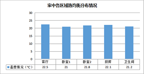 采暖效果:老两口——身体抱恙的男主人因腿脚不便长期在家,需要恒温且温度略高的环境。从数据上看,每个时段,从地面到1.8米高,温度都在20℃以上,温差都在2℃以内徘徊,各个房间的地面温差也是在1℃左右进行浮动,整体测试结果不错。