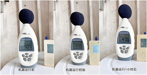静音效果:用户的水箱安装在一层门口,机器开启前后,噪音数值有着一定的上扬。考虑到该户安装机组匹数较大,为10HP,且为二层建筑,室内末端管路较长,所配循环水泵功率稍大,噪音不可避免地会相较前几户稍大,但未超过50dB,距离较远的二层居住空间基本不受噪音影响。