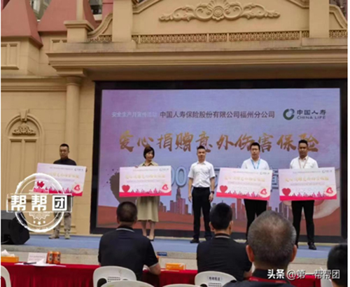 宣传月期间,中国人寿福州分公司在办公大楼、营销职场、经营网点分别通过贴警示牌、LED屏滚动播放宣传口号、多媒体播放宣传视频等形式,扩宽宣传覆盖面;同时以“安全生产大家谈”“晨会夕会”“以案说法”等多样性活动动员全员学习,向全体员工普及安全知识,营造“人人讲安全、个个会应急”的良好氛围。6月底,中国人寿福州分公司参加由福建电视台综合频道《帮帮团》及台江应急管理局主办的“安全生产月”主题宣传活动,现场向四家单位的新市民赠送了60份人身意外伤害险,共计600万元保额,为他们的人身安全提供后续保障。