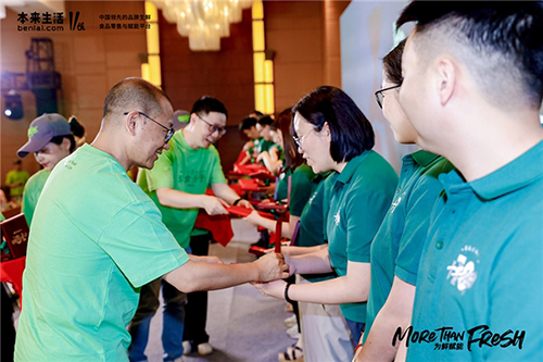 本来生活创始人、CEO喻华峰,本来生活集团高级副总裁曾强在活动中特别为陪伴公司成长已达10年之久的功勋员工授予“十年功勋”荣誉,感谢这支在品牌食品领域最富实战经验的优秀团队长久以来坚守专业,不懈追求更高的效率、更好的服务。