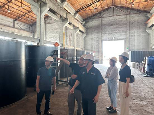 图:该行通过知识产权质押贷款为上海在田环境科技有限公司提供流动资金支持,图为客户经理在企业的带领下参观企业工厂内部。当天气温37度,大家正兴致勃勃地听企业内部人员介绍企业情况。