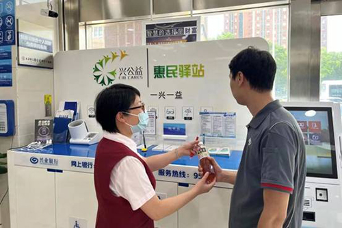 该行已在辖内76家营业网点设置“兴公益”惠民驿站,各网点依托惠民驿站积极开展“夏日炎炎送清凉”便民活动,提供兴业关怀,彰显社会责任。