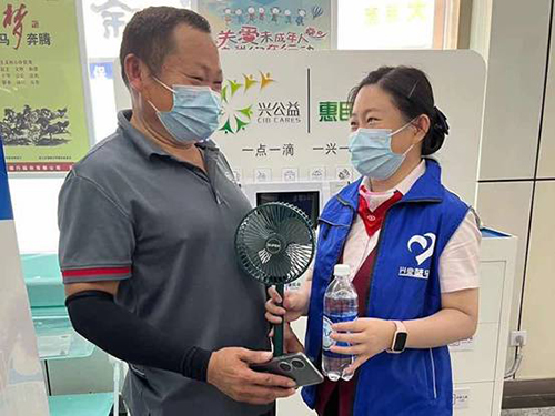 在金山支行,工作人员精心准备了免费冰镇饮料、血压仪、充电器等设备,方便往来的客户;松江支行为顺丰师傅递上一瓶水、一个小风扇,送去一点清凉、一丝温情;武宁支行为清洁工师傅准备了防蚊用品,让城市一线基层工作者感受到兴业温暖。