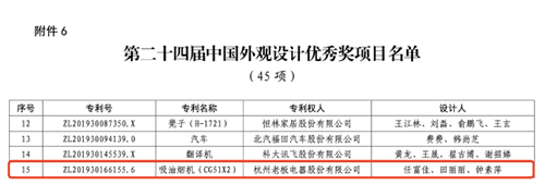 近日,国家知识产权局公布了第二十四届中国专利奖授奖的决定,对在实施创新和推动经济社会发展等方面作出显著贡献的专利权人、发明人(设计人)以及相关组织者给予表彰。经由中国专利奖评审委员会评审,社会公示等,杭州老板电器股份有限公司的吸油烟机(CG51X2)(专利号:ZL201930166155.6)荣获外观设计优秀奖。