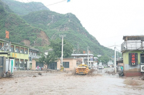中国燃气抢险车冒着洪水进入保定涞水县野山坡景区抢险