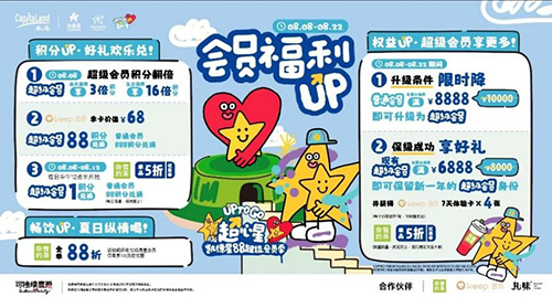8月8日,2023凯德星88超级会员季在全国正式开启。作为凯德一年一度的宠粉节日,今年的活动以“UP TO GO”为主题,象征会员权益的全面升级。8月8日至 8月22日期间,凯德联动奈雪的茶、Keep、丸味等多家品牌合作伙伴,在全国19座城市的40余家凯德购物中心,推出力度空前的会员权益与一系列精彩纷呈的线下活动,为会员带来狂欢盛宴。