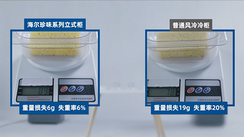 相同的海绵,同样放进风冷冷柜,结果却截然不同。48小时后,储存在海尔珍味系列立式柜鲜冻保湿抽屉的海绵,颜色、重量较存入前没有特别明显的变化,失重率仅为6%;而在普通风冷冷柜的海绵颜色明显变浅、重量变轻,失重率达到20%。