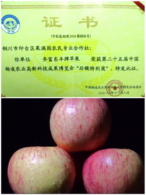 地理优势与人工用心培育下,果满园农民专业合作社的生产的苹果,个大、果形正,色泽鲜艳红润,外表光滑细腻,口味酸甜适口,老少皆宜。并于2017年、2018年先后荣获了第二十四届中国杨凌农高会“后稷奖”和第二十五届中国杨凌农高会“后稷奖特别奖”。其合作社也被评为市级和省级示范社、陕西省重质量守信誉先进单位和国家级示范社。底气来自于“好质”支撑,依靠优质品牌果品,齐富东丰与福建、江西、湖南、湖北、广东等地客商建立了稳定的渠道,并以市场为向导,不断扩大生鲜超市等经营销售渠道,拓宽销售市场。同时,借助电商优势,在淘宝商城和微信开设合作社的品牌专营店,让传统的销售通过网络走向更加广阔的市场。