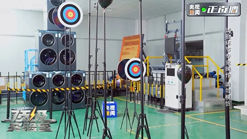 现场6台双子T5组成的近4米的“双子塔”,正在高速运转。主持人李京京开启“双子塔”上的激光笔,并将其对准靶心。随着遮挡靶移开,激光精准穿过靶心并击穿了后面的气球。
