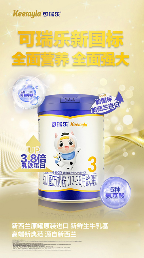 可瑞乐之所以能快速通过婴幼儿奶粉新国标注册,与新西兰New Milk工厂强大科研能力和高标准的品控保障有着直接联系。从产品到产业到渠道,可瑞乐秉持消费者的需求,打造科学性更强、营养更全面的奶粉配方,精准体现“纯净营养、优益成长”的品牌理念,是一款高品质的新国标奶粉。