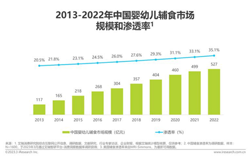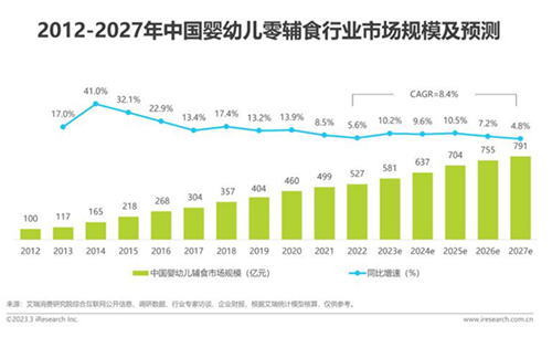 尽管受到外围环境等影响,中国婴幼儿辅食市场依然韧性成长;到2022年,中国婴幼儿辅食市场规模持续增长至约527亿元。