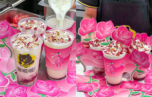 甜啦啦搭载七夕推出的新品,原料选用应景的玫瑰,包材上则结合节日和营销玩法,有粉色系玫瑰+牛郎织女的国潮杯套,还有结合《念念相忘》,打造的线下“全糖爱情”甜蜜体验店,为年轻用户带来节日的双倍甜蜜。