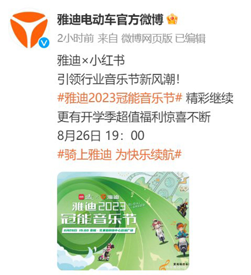 暑假即将结束,广大学子们马上就要迎来开学季。国民电动车品牌雅迪再次联动小红书,以年轻人喜爱的潮流音乐节形式,为品牌增添新活力,赋能开学季安全出行。8月26日,贵阳花果园购物中心沿湖广场,雅迪2023冠能音乐节即将盛大开启,届时关喆、饭思思等人气歌手将现场献唱,嗨翻全场,给年轻用户带来一场沉浸式的音乐狂欢盛宴。