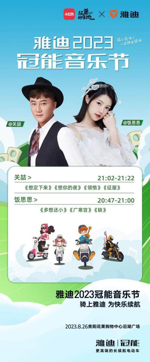 本次雅迪2023冠能音乐节可谓星光熠熠,看点十足。“中国内地实力唱作人”关喆、千万粉丝级网络歌手“小张韶涵”饭思思倾情加盟,为大家带来《想你的夜》、《领悟》等多首耳熟能详的热门歌曲,势必要将音乐节的快乐躁动值拉满!同时,雅迪将在抖音、视频号官方平台开启全程线上直播,并与线下全国终端门店开展联动直播,为全球超7000万雅迪用户送上视听盛宴。