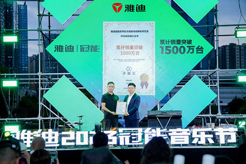 本次音乐节上,雅迪冠能还宣布了全新定位:更高端的长续航电动车。凭借真正长续航的优势,3年来雅迪冠能系列不断实现新突破,累计销量已突破1500万台。国际权威咨询机构弗若斯特沙利文也向雅迪科技集团颁发了雅迪冠能系列在长续航电动两轮车行业的市场地位确认证书:雅迪冠能系列累销1500万台再创行业单系列销量纪录!作为全球中短途出行领导者,雅迪始终秉承“让亿万人享受美好出行”的使命,为高品质出行持续冠能,领跑长续航赛道。
