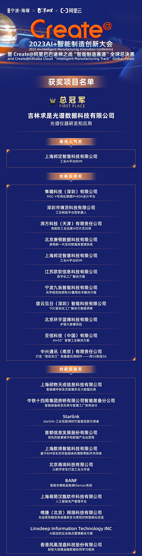 8月24日上午, 2023Create@阿里巴巴诸神之战“智能制造赛道”全球总决赛顺利收官。大赛历时4个月,吸引了来自中国、美国、英国、德国、印度、韩国等多个国家的400余家的企业参赛报名,经过长三角、京津冀、粤港澳、海外、创客北京专项赛五大赛区的层层比拼后,23家创新企业最终入围全球总决赛,覆盖智能传感器、光谱检测、芯片设计、智能网关等多个领域,其中不乏工业AI等前沿的技术创新和应用,业务范围也延伸到了智能制造产业链的各个环节。