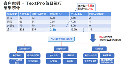 该企业首日使用TextPro进行系统MIRO取代手工MIRO来处理直接采购、间接采购、关联方采购三种业务类型的发票以及过账凭证,便取得了显著的成果。TextPro的使用使得平均处理时间由19.5小时提升至2.3小时,效率提升8.5倍,发票通过率达到94%,并及时提示发票匹配有误、对账单有误以及合规问题三大类原因导致的问题发票,协助企业规避财务及业务风险。