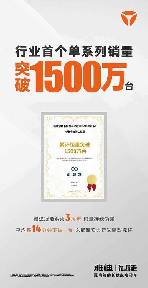 此次授予雅迪冠能系列“在长续航电动两轮车市场累计销量突破1500万台”认证,是弗若斯特沙利文团队基于对全球中短途出行市场的调研和分析做出的权威确认。这也表明,雅迪正以不断突破行业上限,刷新行业记录的发展态势,打造引领行业变革的旗舰之作。雅迪冠能系列不仅是绿色出行的引领者,更是领冠行业的新标杆。