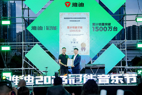 8月26日,雅迪2023冠能音乐节在贵阳盛大举行。现场,国际著名权威咨询机构——弗若斯特沙利文(Frost & Sullivan,以下简称“沙利文”)向雅迪科技集团颁发了雅迪冠能系列累计销量1500万台认证证书。此次获国际权威机构认证,不仅展现了雅迪冠能系列再破行业销量记录的傲人成绩,也完美印证了雅迪在全球中短途出行领域的领导地位。