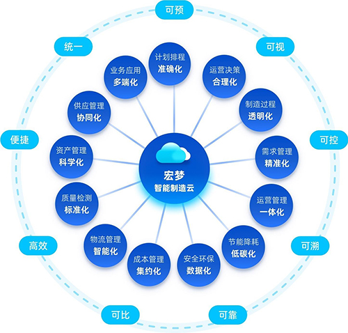 宏梦智能制造云是一款基于工业互联网理念及体系架构开发的平台级产品,在整线一体化智造思路下,平台构建遵循统一化原则,MES、ERP、CRM、SCM、SRM、SCADA等系统多产品组合能力,可实现统一平台支撑下的多系统建设。