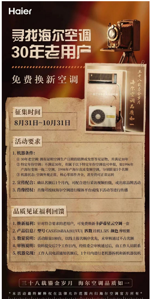 现在,“寻找海尔空调30年老用户”的活动仍在继续。即日起至10月31日,只要您家里的空调使用超过30年,就可以免费换新一台新空调。各大海尔空调专柜均可报名,快来领取你的幸运大礼吧!