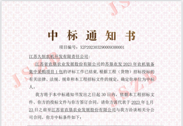 此次中标是对江苏久恒实力的认可,是公司在农业领域农机细分市场的竞争中的一次胜利,为公司今后的业务开拓和战略布局奠定了坚实的基础。