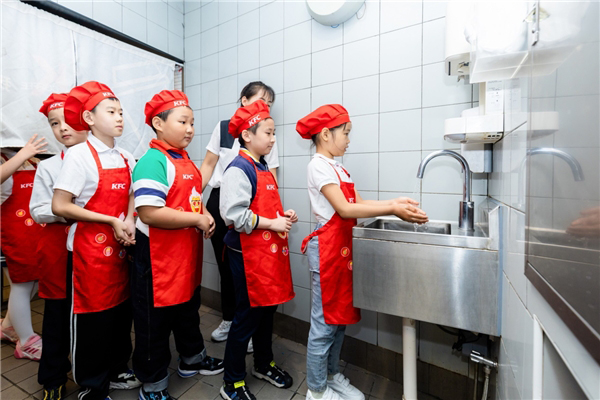 小朋友们穿戴好围裙帽子,变身“探秘体验官”,跟着餐厅经理走进了肯德基的后厨开始探秘之旅。从学习标准洗手流程到认识水过滤系统,食品包装使用规范等食品安全规范的操作流程等,“体验官”从学校标准洗手流程又解锁了店里的水过滤系统,解冻区、冷冻区,还了解了食材保质期规范等等。在店内工作人员的介绍下,“体验官”对肯德基的食品安全规范操作有了更多的了解。当亲眼看到肯德基餐厅内带紫外线杀菌的三重水过滤系统等一系列的智能管理方式,小朋友们不由得发出阵阵感慨:“肯德基的后厨干净又规范,让我们更加理解食品安全的重要性。”
