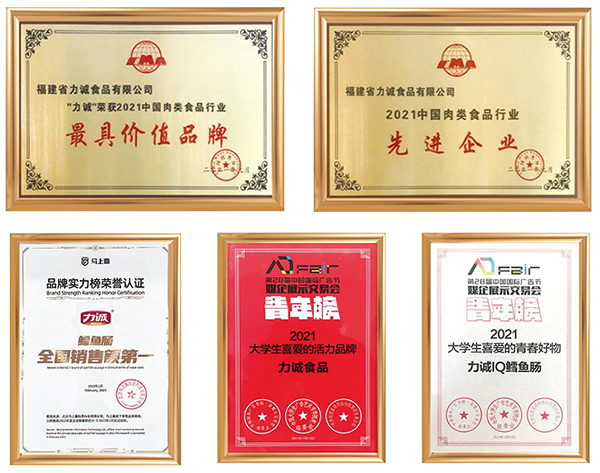 多年来,力诚食品不断被授予各种优异的奖项,近年来更是荣获“2021年中国肉类食品行业先进企业”、“2021年中国肉类食品行业最具价值品牌”、“大学生喜爱活力品牌”、“大学生喜爱青春好物奖项”及其他各类奖项,获得了“中国肉类协会第五届常务理事单位”的荣誉称号,力诚食品的匠心和创新精神不断被行业肯定。