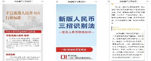 兴业银行北京分行结合消费者保护教育宣传月活动,积极制作并转发新版人民币真假识别,不宜流通人民币纸硬币行业标准等微信宣传内容,制作贴近生活、亲和力强的宣传微视频与美篇,将反假货币与现金宣传内容传递到更多群众身边,为提升全民反假意识,共同净化首都人民币流通环境贡献力量。