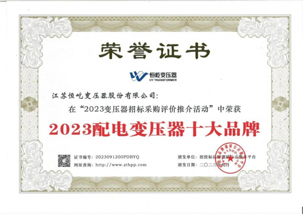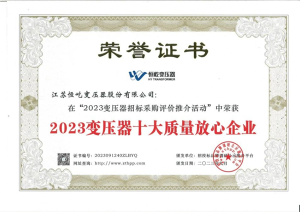 一分耕耘一分收获。在发展过程中,江苏恒屹始终将产品品质放在首位,也因此在变压器行业中取得众多成果,树立了良好的形象。近期,江苏恒屹顺利通过了国家电网公司10KV及以下电压等级变压器的供应商资质能力核实,成功获得了《供应商资质能力核实证明函件》(简称“一纸证明”)。这一荣誉是对江苏恒屹技术实力和产品质量的肯定。更值得一提的是,在近日由招投标品牌调研公示服务平台主办的“2023变压器招标采购评价推介”活动中,江苏恒屹变压器股份有限公司凭借其卓越的产品质量、技术创新以及良好的市场口碑,再添殊荣,斩获“2023变压器十大质量放心企业”和“2023配电变压器十大品牌”两项大奖。