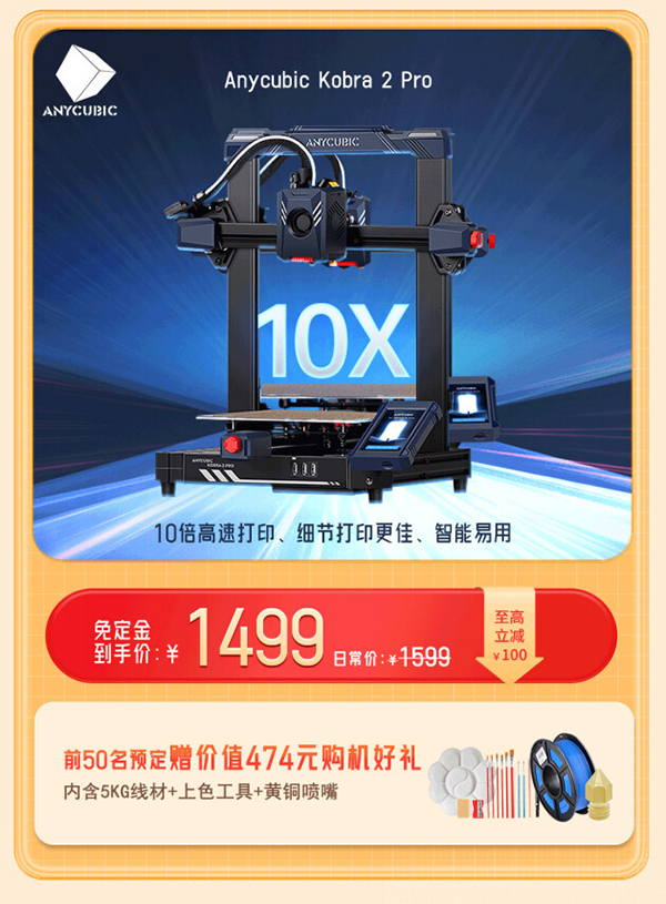 仅需14分56秒,即可打印完成标准的小船模型!作为纵维立方高速家族中的“速度之王”,Anycubic Kobra 2 Pro以500mm/s的至高打印速度及20000mm/s²至大加速度成为追求畅快打印体验的科技达人们的首选。不仅有高速实力,也同样有高质表现。得益于一键振动补偿与“流量控制”智能补偿回抽回填,确保了打印模型的细节及高精度展现。此外,还有着诸如纵维立方APP远程操控、LeviQ 2.0自动调平系统等智能化体验!