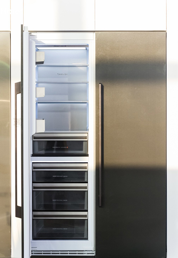 第二,产品材质升级,融境冰箱不仅可随意更换橱柜门板的款式,还搭载了素色不锈钢面板和钛金属不锈钢面板,匹配用户不同的厨居风格需求。设计上不仅可以一门到顶,还可以落地式推入,让每次拿取都极具仪式感。