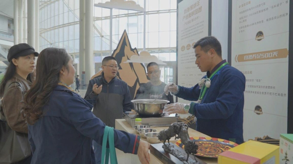 除了布拖黑绵羊,展馆内,布拖县盛产的乌洋芋、乌金猪、蓝莓酒、金丝皇菊、牛肉干、洋芋粉丝等诸多品质出众、产量稀有的区域特色农产品,也源源不断引来观众品尝。