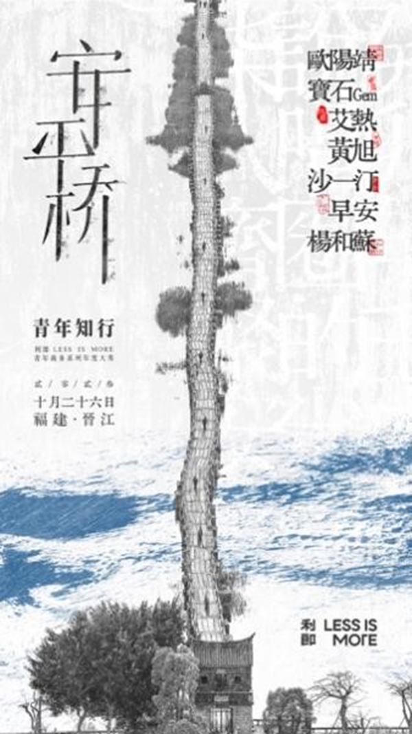 此次系列活动的灵感来源,还要从一座拥有885年历史的古桥说起。安平桥始建于南宋1138年,它凝练宋代的简约智慧,无拱无索,无雕无饰,一道2255米的直线横跨海湾,是中国福建省泉州市境内链接晋江市和南安市的一座桥梁,是中国现存最长的跨海梁式古石桥,也是珍贵的世界文化遗产。它的建成源自885年前敢于知行探索的人们,他们首创睡木沉基法奠定成桩,再以候潮架梁法搭建桥体,总耗时14年,花了两代人的心血才建成这“天下无桥长此桥”的简约之道。