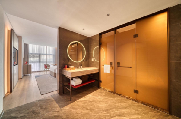 独特设计的开放式洗手间布局,让客房的视觉空间更显宽敞,30平米的房间内创造出轻奢级别的卫浴系统,包括独立淋浴、马桶间和开放式洗手台。结合智能梳妆镜、轻智能自动马桶和美容全身镜,全方位打造舒适卫浴体验。两区科学分隔,营造出和谐的私密空间。睡眠区床品使用高密度纯棉贡缎织做,质地柔软、表面平滑、透气性绝佳,让人安然沉睡于宁静的舒适中。