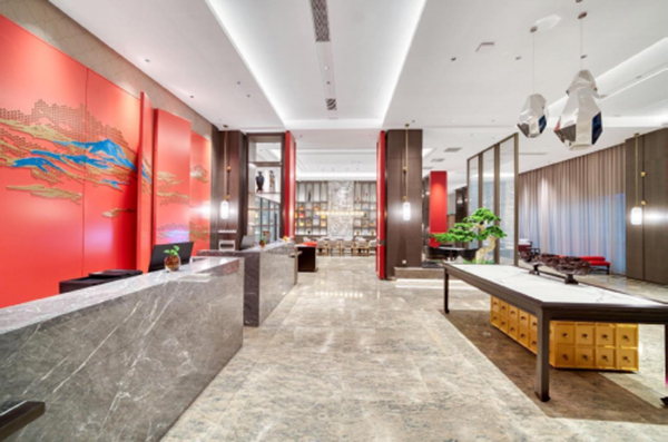 大堂左侧壁画将描绘苏南本地文化特色的古代诗画做了现代化的演绎,既具有东方古典茶文化的雅致,有现代审美的序列感和仪式感,右侧来自来自怡程三元色系统的红黄蓝三色的古典器物阵列式的势如破竹,点缀大堂,充满禅意的枯山水造景内敛含蓄。种种细节,让怡程3.0的大堂典雅大气,处处讲述着东方生活方式故事。