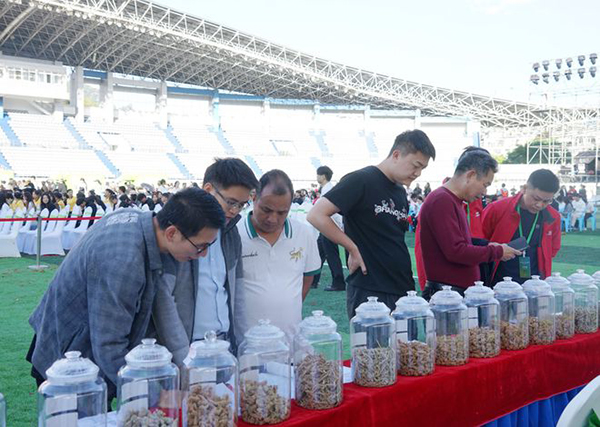11月8日上午,首届文山三七大型拍卖会在云南省文山市盘龙体育馆举行!文山壮族苗族自治州州委常委、文山市委书记蒋俊、文山市委副书记、市长乐加文、中国中药协会秘书长王桂华、原中国中药有限公司党委书记、中国药文化研究会会长禹同生、广东省广州国际医药港集团总裁、广东跑合中药材电子商务有限公司董事长卢汉坤、广东跑合中药材电子商务有限公司副董事长陈钦大、云南省中药材种植养殖行业协会会长苏豹、中国中药协会中药材种植养殖专业委员会资深专家、专家委员会副主任、跑合网产业顾问刘红卫,以及来自全国各地的多家商协会代表、中药饮片厂代表、文山三七企业代表、采购商等参加了本次三七大型拍卖会。