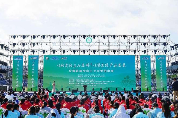 广东省广州国际医药港集团总裁、广东跑合中药材电子商务有限公司董事长卢汉坤表示,本届拍卖会聚焦三七大宗交易,帮助三七种植户解决销售难题、卖出好价,让三七现货交易不断显现新活力,塑造文山三七品牌形象,带动文山三七产业、物流、供应链金融等优化升级,充分发挥文山三七区域品牌和产地优势,助推文山三七产业高质量发展,构建以拍卖会带动三七产业展示交流、资源共享的“一会多元”新格局。希望与在座各位中医药企业家、商户、采购商等同行共谋发展,共享红利,共同开创三七行业更美好的明天,助力实现文山“世界三七之都,千亿三七产业”的宏伟蓝图。随后卢汉坤董事长宣布全国首届文山三七大型拍卖会正式开始!