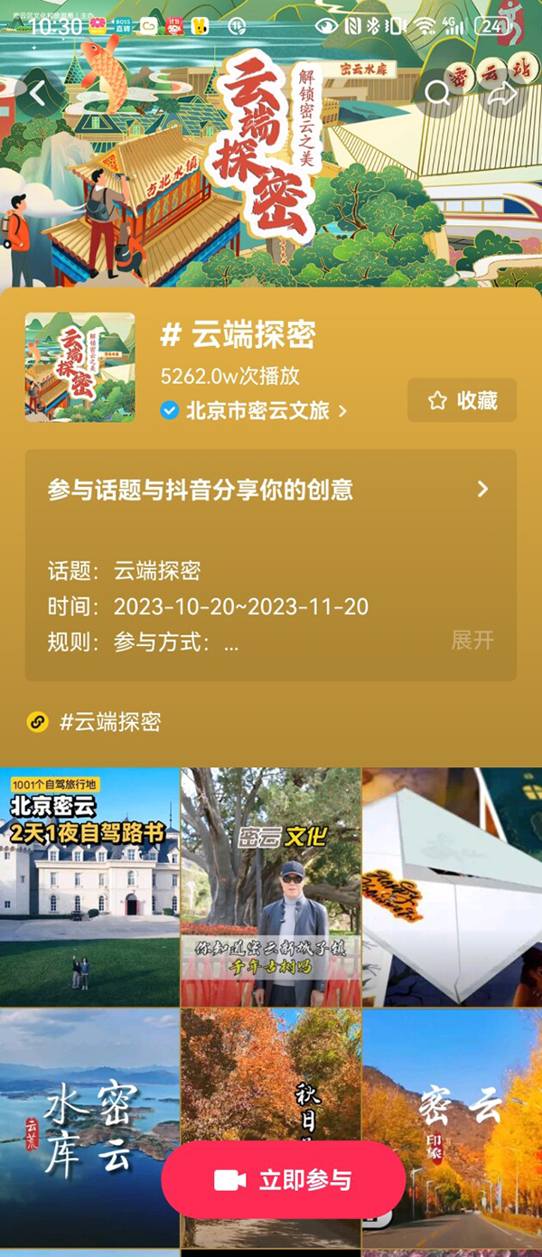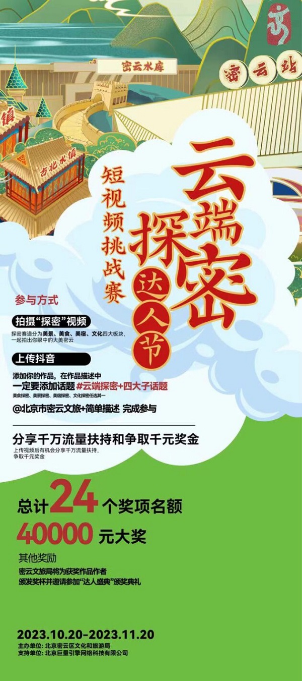 近日,密云达人节活动正式启动,本次活动由北京市密云区文化和旅游局主办,旨在给建设和守护密云水库的乡亲们重要回信精神。以借助新媒体短视频传播作用,吸引广大用户参与密云文旅共建,提升密云旅游品牌的知名度。活动将持续至11月20日,总奖金高达4万元。