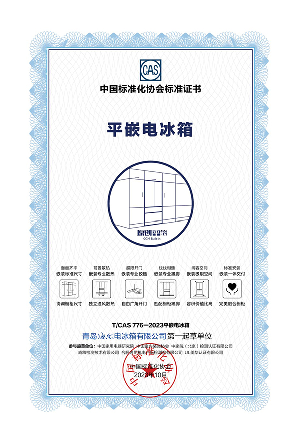 在新一代厨房中,卡萨帝原创平嵌冰箱通过升级底部前置散热科技、优化保温系统,让箱体可完美匹配深600mm、宽800mm的国际标准橱柜,实现了两侧0闪缝、正面0凸出;以嵌入式铰链保证冰箱两侧紧贴橱柜也能90°直角开门,抽屉可以顺利拉出,113°大角度开门也不会碰壁;通过创新底置循环风幕科技,卡萨帝冰箱将核心部件微缩集成在底部,拓展出更大冷冻空间;加入了与橱柜踢脚、腰线、门缝线齐平的追线设计,冰箱与橱柜线线相通、面面齐平,宛若一体。满足用户进阶需求的同时,卡萨帝原创平嵌冰箱也获得了专业认证,“纯平无缝、大角度开门、嵌入安装限制少、冷冻抽屉更深”这些优势被标注在了德国VDE证书中。