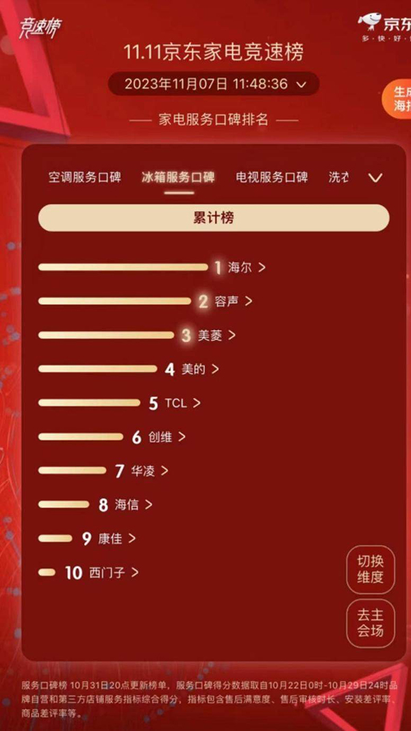 当冰箱被用户下单后,一场关于服务、品质的全方位检验才刚刚开始。仍以海尔为例,在2023年11月22日-24日召开的2023年满意中国大会,其斩获了“2023年行业用户满意度第一名”,且已是连续十余年获此殊荣。在刚刚结束的双11,京东家电“冰箱服务口碑”第一名也花落海尔。