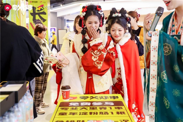 11月24日,西安大悦城内人流涌动,不少身着汉服的姑娘们来到一家炸串店,一人抱着一个串桶,又吃又玩,玩到开心处,还即兴组团跳起舞来。热舞的汉服女团与门店墙面上丰腴可爱的持串仕女图相映成趣,构成了一幅新潮与古风相融的奇妙景象。