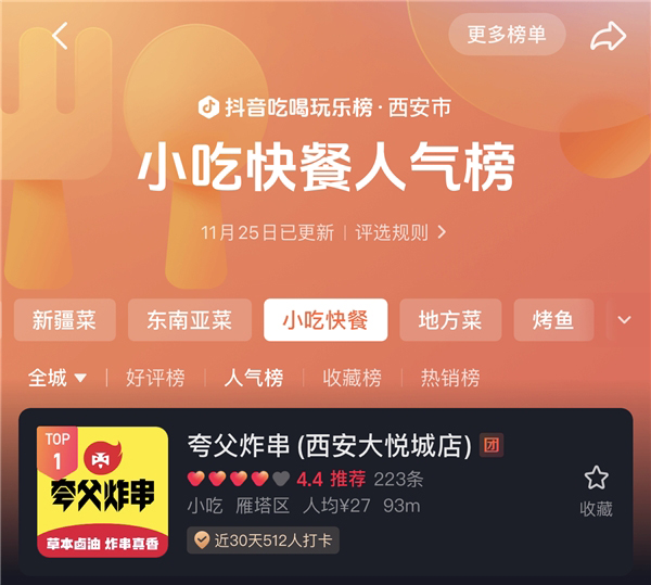 现场火爆场景被不少年轻人发到各大社交平台,继而引发了大量网友围观。在线下主场,更多年轻消费者加入排队队伍中来,夸父品牌方还贴心准备了潮流棒球帽、年轻人的社交货币飞盘等周边,获得一众好评。在当天的小红书、抖音、大众点评等平台,该门店快速成为“网红打卡地”,门店开业一天不到就封顶了抖音小吃人气榜第一名,受到消费者和大悦城商场的双重认可。作为西安商场标杆的大悦城,不仅不仅与夸父炸串进行了强联名,还将夸父炸串作为商城五周年庆的第一弹重磅推出!这是年轻的品牌文化与城市文化融合碰撞出的神奇火花。