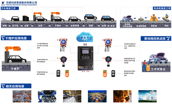 与此同时,汉威科技集团还针对汽车制造过程推出了一系列安全监测产品及解决方案。在汽车制造过程中,涂装车间在调漆、喷漆过程中,会产生总烃、甲烷、苯、甲苯、二甲苯、非甲烷总烃等VOC气体,危害人体健康;干燥炉的燃料LNG可能出现泄漏,进而产生爆炸风险,其排出的废气成分中往往会伴有CO,容易发生泄漏;总装车间会产生大量CO、NO2等有毒有害气体,容易引起化学中毒;发动机性能测试实验中易发生燃料泄漏。