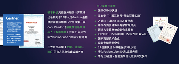喂车科技联合创始人兼CTO唐傲介绍能源零售数智化发展以及新型综合能源服务站数智化应用的重要性。“我们为每个客户提供端对端的企业服务工具箱,这背后需要持续的高质量研发投入,这也是我们作为行业陪跑者的底气,Gartner授予Cool Vendor,再到华为FusionCube 500认证,再到本季度通过CMMI5评估,「客户为先,科技底色」是我们不变的坚持”。